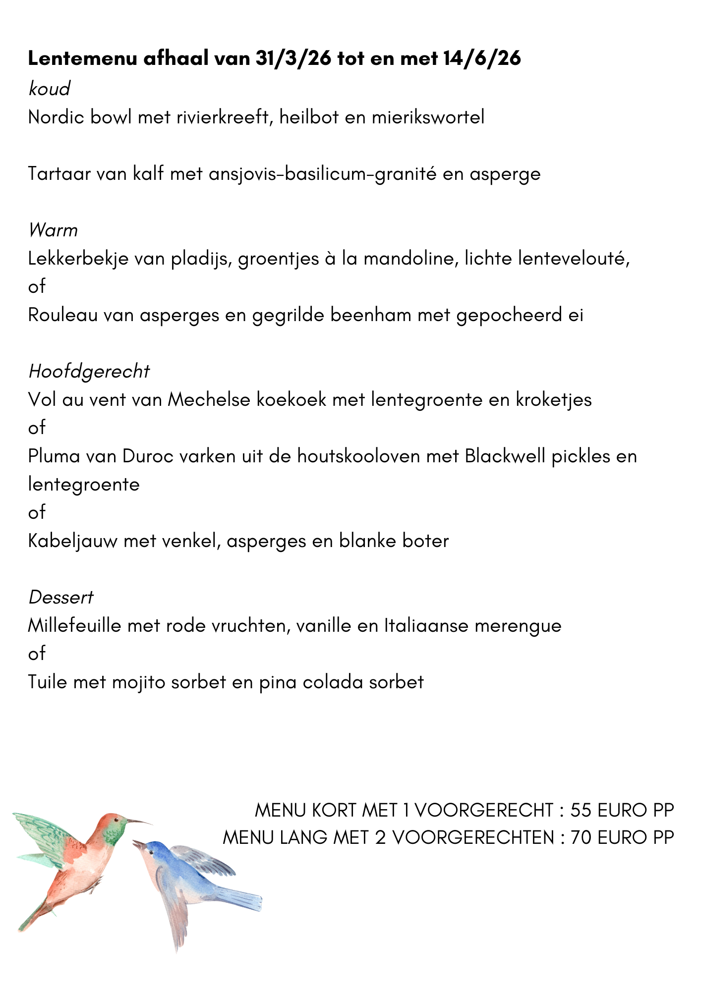 Onze menu”s of gerechten daaruit kunnen ook afgehaald worden…